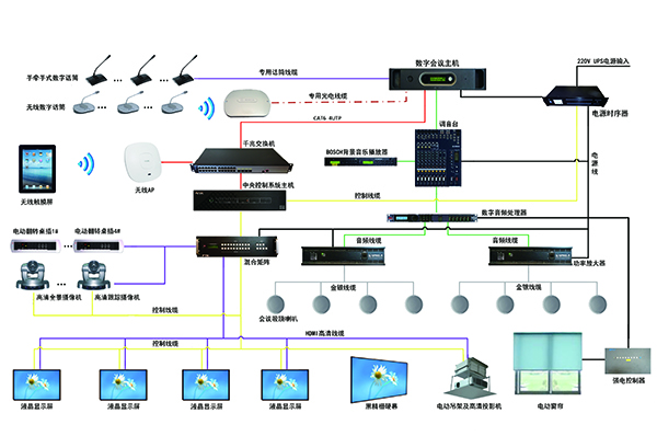 數字會議系統(tǒng)包括智能中央矩陣控制系統(tǒng)、無線觸摸控制系統(tǒng)、數字會議系統(tǒng)、音頻擴音系統(tǒng)、自動跟蹤攝像系統(tǒng)、大屏幕顯示系統(tǒng)以及網絡視頻會議系統(tǒng)、智能照明控制系統(tǒng)等。