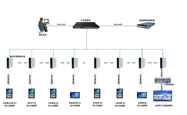 整個辦公區(qū)采用數(shù)字公告系統(tǒng)實現(xiàn)信息發(fā)布顯示,遵循安全性、穩(wěn)定性、可擴展性、管理維護便捷性的設(shè)計原則,C/S與B/S結(jié)合的架構(gòu),網(wǎng)絡(luò)及服務(wù)器占用率極低,數(shù)據(jù)安全存儲并管理,開放的API接口。整個辦公區(qū)設(shè)計8套顯示終端,覆蓋辦公區(qū)主要進出口通道及公共區(qū)域,系統(tǒng)通過中央控制端對各個顯示終端進行統(tǒng)一管理、內(nèi)容發(fā)布。